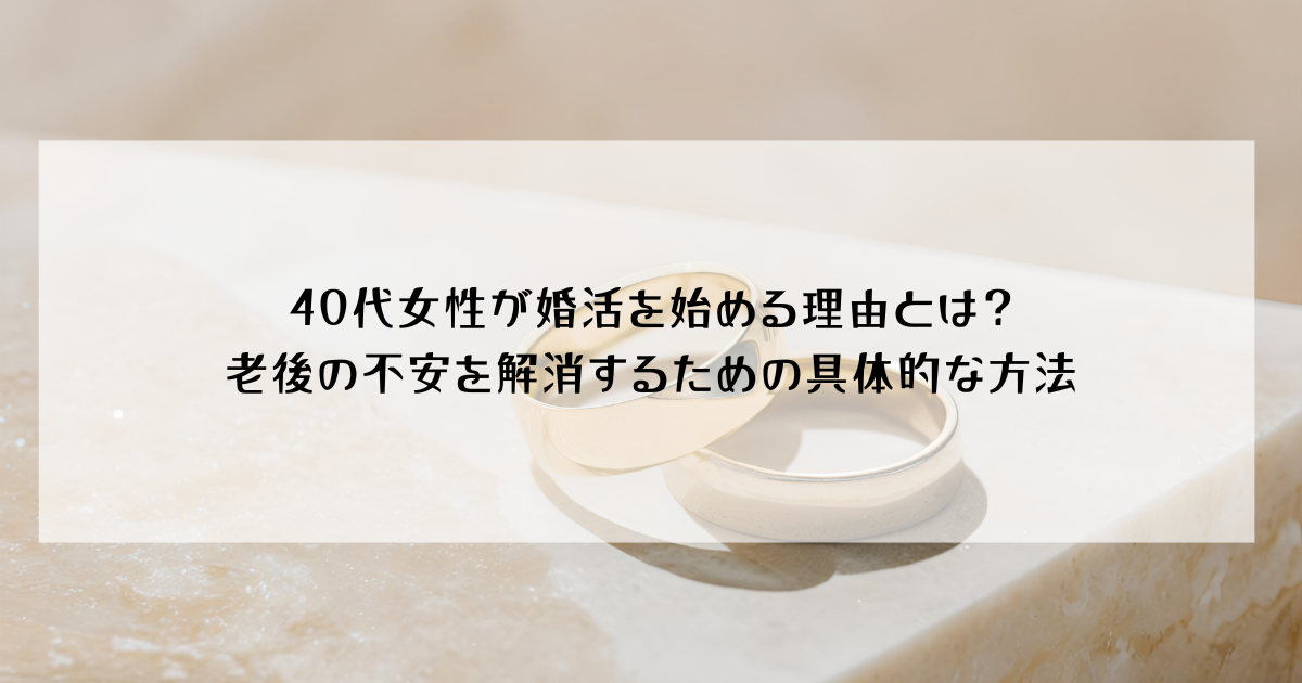 本記事では、40代女性が抱える老後不安の正体を明らかにし、婚活という選択肢がどのようなメリットをもたらすのかを詳しく解説します。また、婚活以外の選択肢や、実際に行動を起こして人生を変えた方の事例もご紹介しますので、ぜひ最後までお読みください。